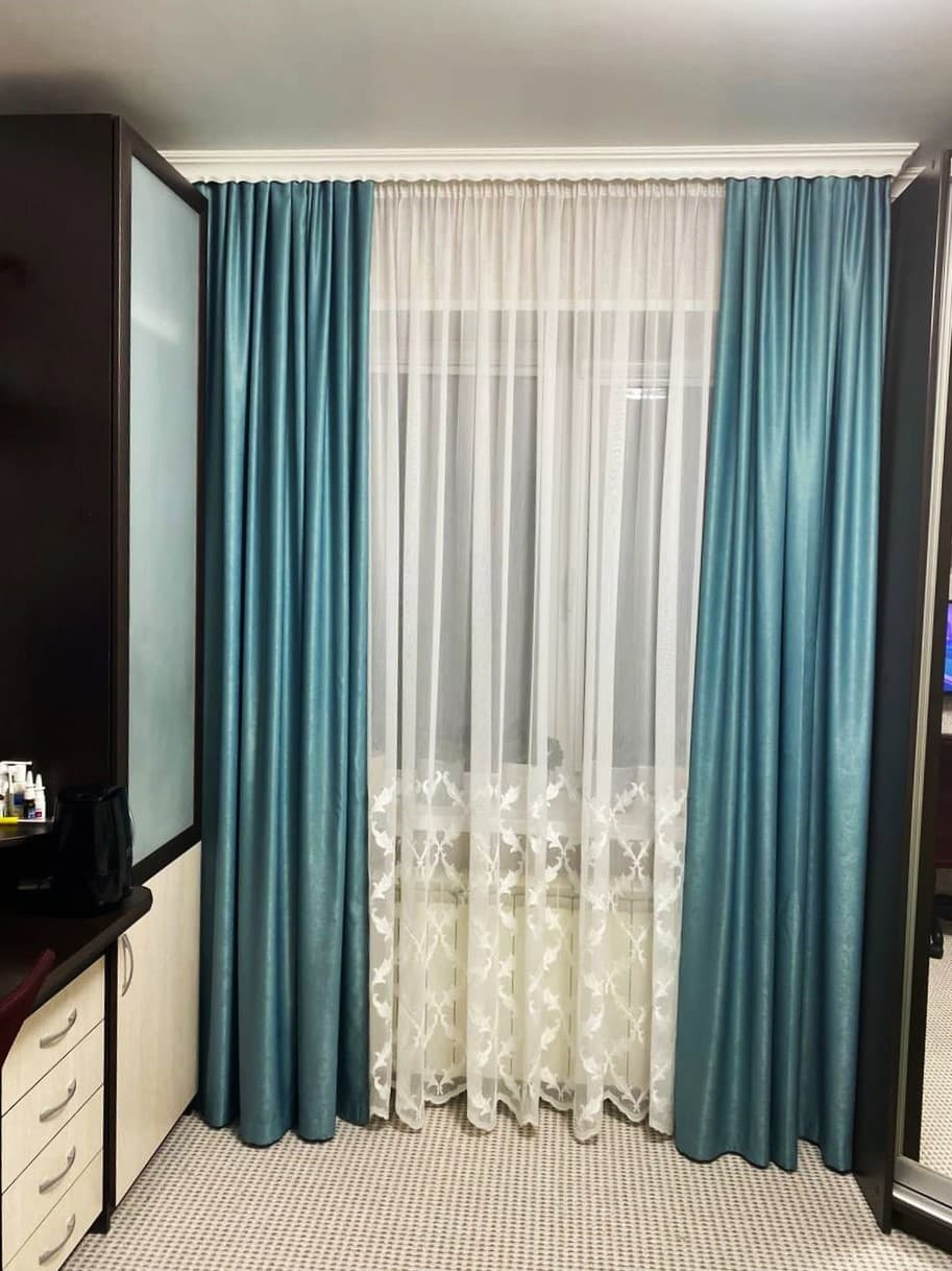 Существует стандарт, по которому высота штор от пола должна составлять 1.5-2 сантиметра. Но это не обязательное условие и высота обговаривается отдельно с заказчиком с учетом пожеланий.
